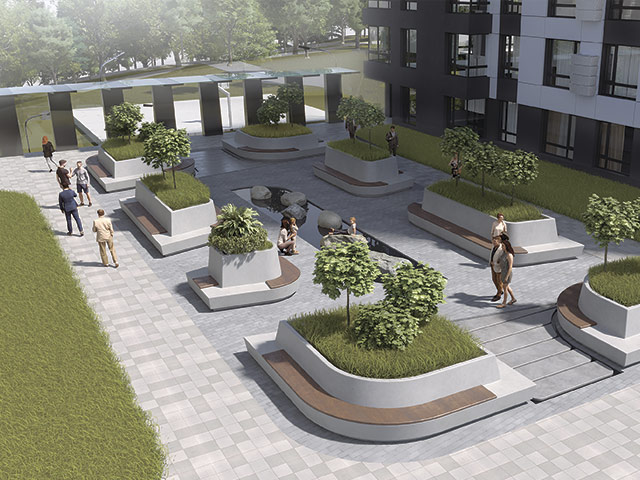В LAKETOWN внутрішні двори між будинками відмежовані від вулиці, тому простір всередині кварталу буде тихим і затишним. Доступ до подвір’я матимуть тільки мешканці містечка. Зручні лавки, зелені насадження, — ми подбаємо про те, щоб на внутрішньому подвір’ї було все гарно та охайно для відпочинку та дозвілля.
